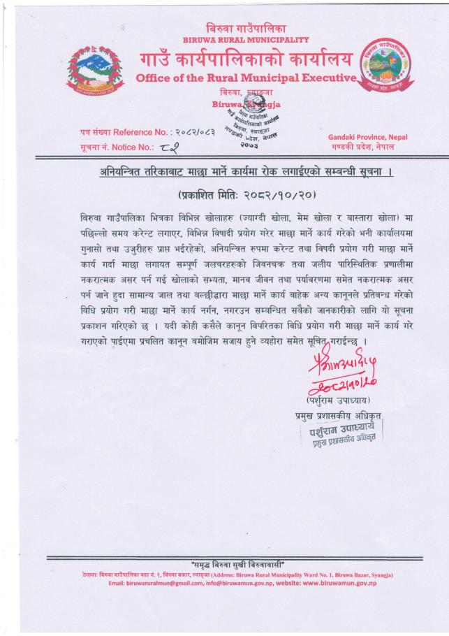 » अनियन्त्रीत तरिकाबाट माछा मार्ने कार्यमा रोक लगाईएको सम्बन्धी सूचना।