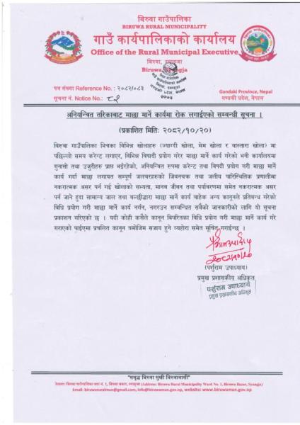 अनियन्त्रीत तरिकाबाट माछा मार्ने कार्यमा रोक लगाईएको सम्बन्धी सूचना।
