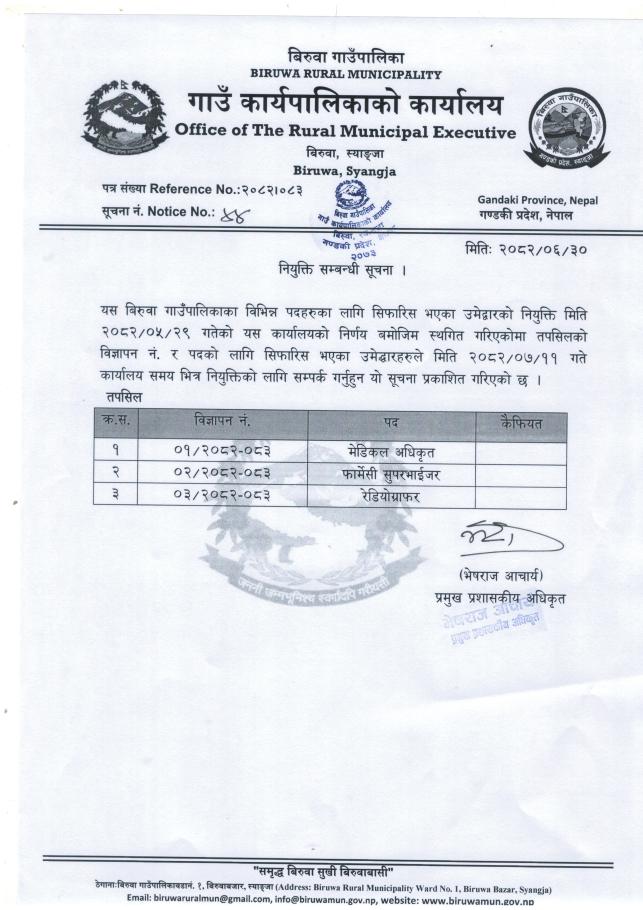 नियुक्ति सम्बन्धी सूचना।