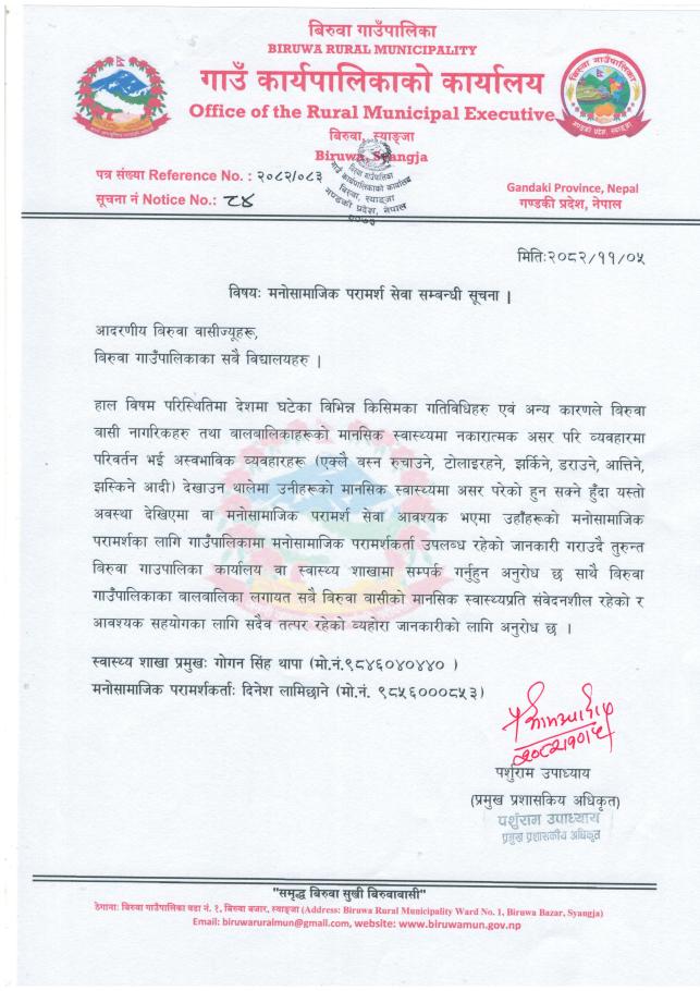 मनोसामाजिक परामर्श सेवा सम्बन्धी सूचना।