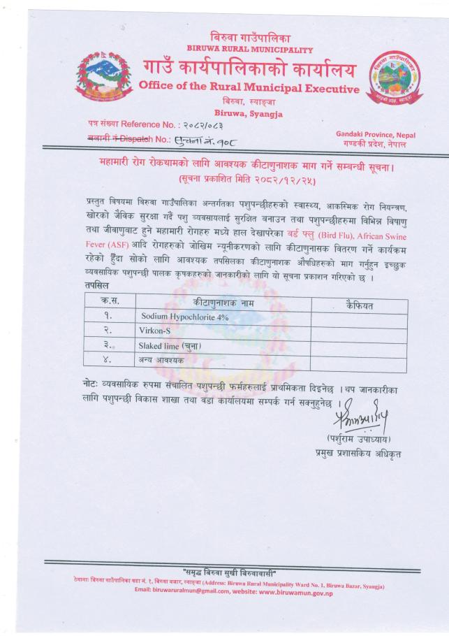 महामारी रोग रोकथामको लागि आवश्यक कीटाणुनाशक माग गर्ने सम्बन्धी सूचना।