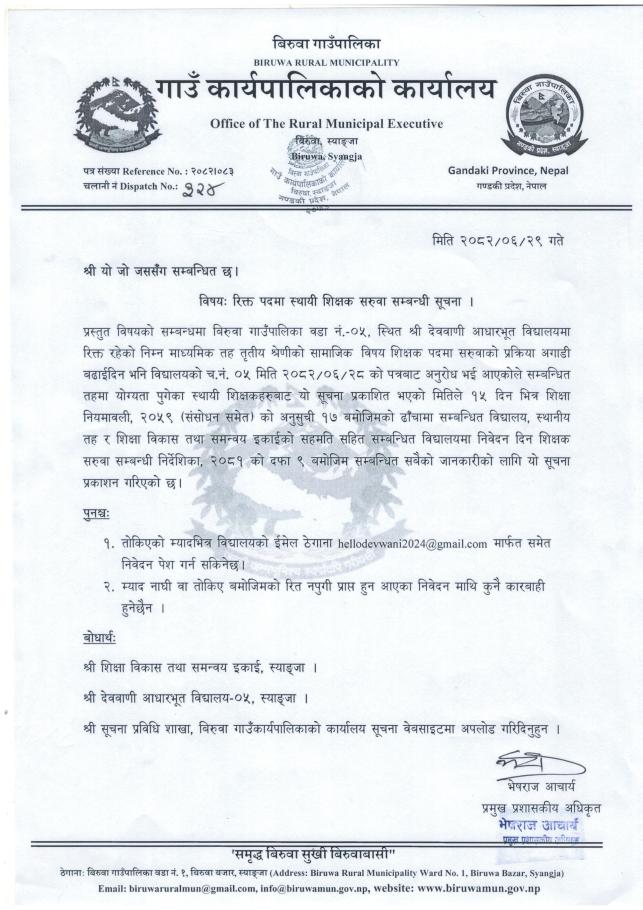 रिक्त पदमा स्थायी शिक्षक सरुवा सम्बन्धी सूचना।