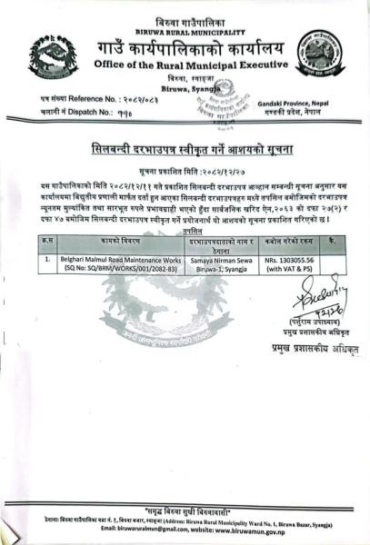 » शिल्बन्दी दरभाउपत्र स्वीकृत गर्ने आशयकाे सूचना।