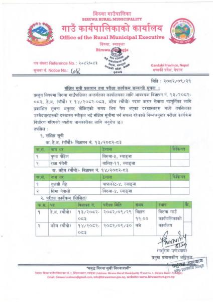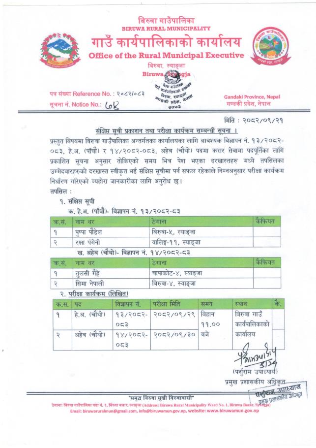 संक्षिप्त सूची प्रकाशन तथा परिक्षा कार्यक्रम सम्बन्धी सूचना।