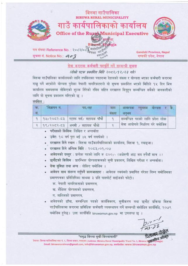 सेवा करारमा कर्मचारी पदपूर्ती सम्बन्धी सूचना।