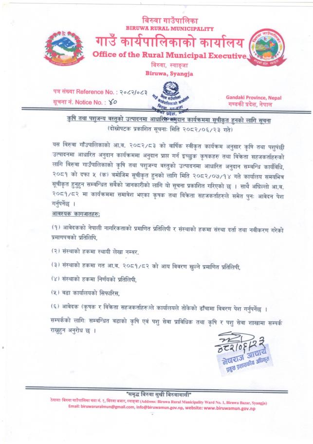 » कृषि तथा पशुजन्य वस्तुको उत्पादनमा आधारित अनुदान कार्यक्रममा सूचीकृत हुनको लागि सूचना।