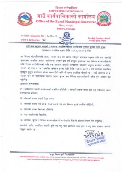कृषि तथा पशुजन्य वस्तुको उत्पादनमा आधारित अनुदान कार्यक्रममा सूचीकृत हुनको लागि सूचना।