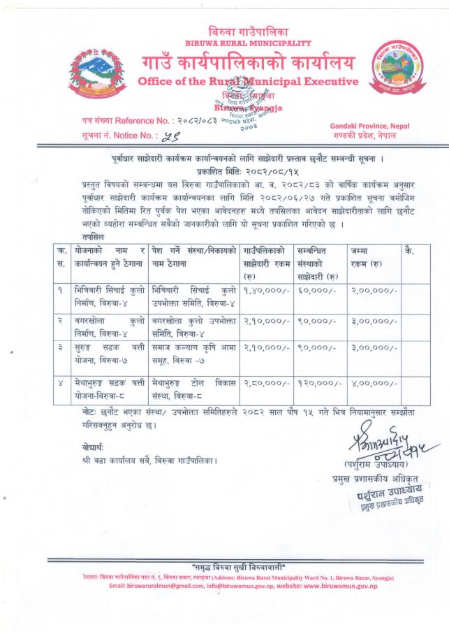 साझेदारीमा सामुदायिक भवन निर्माण कार्यक्रम कार्यान्वयनको लागि साझेदारी प्रस्ताव छनौट सम्बन्धी सूचना।